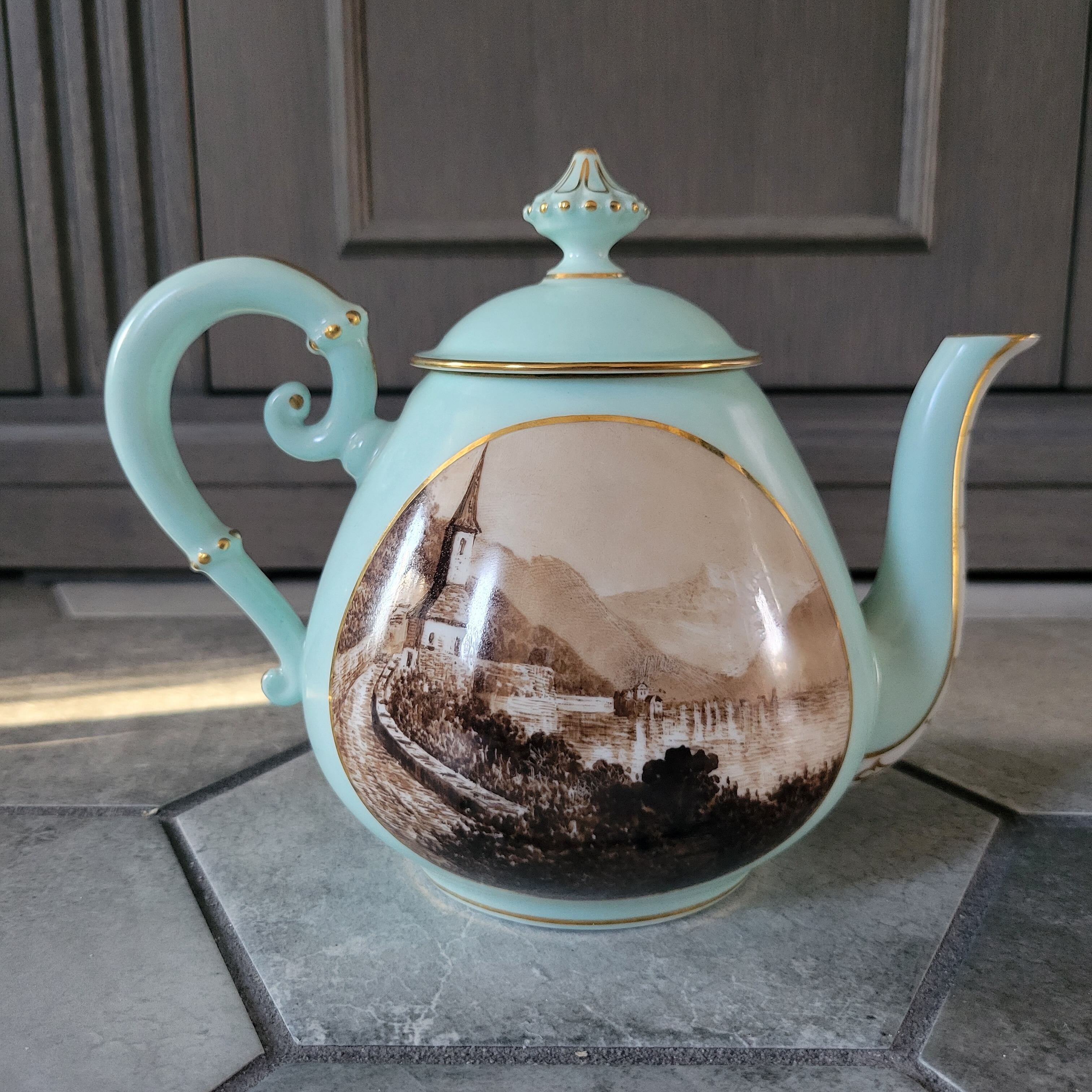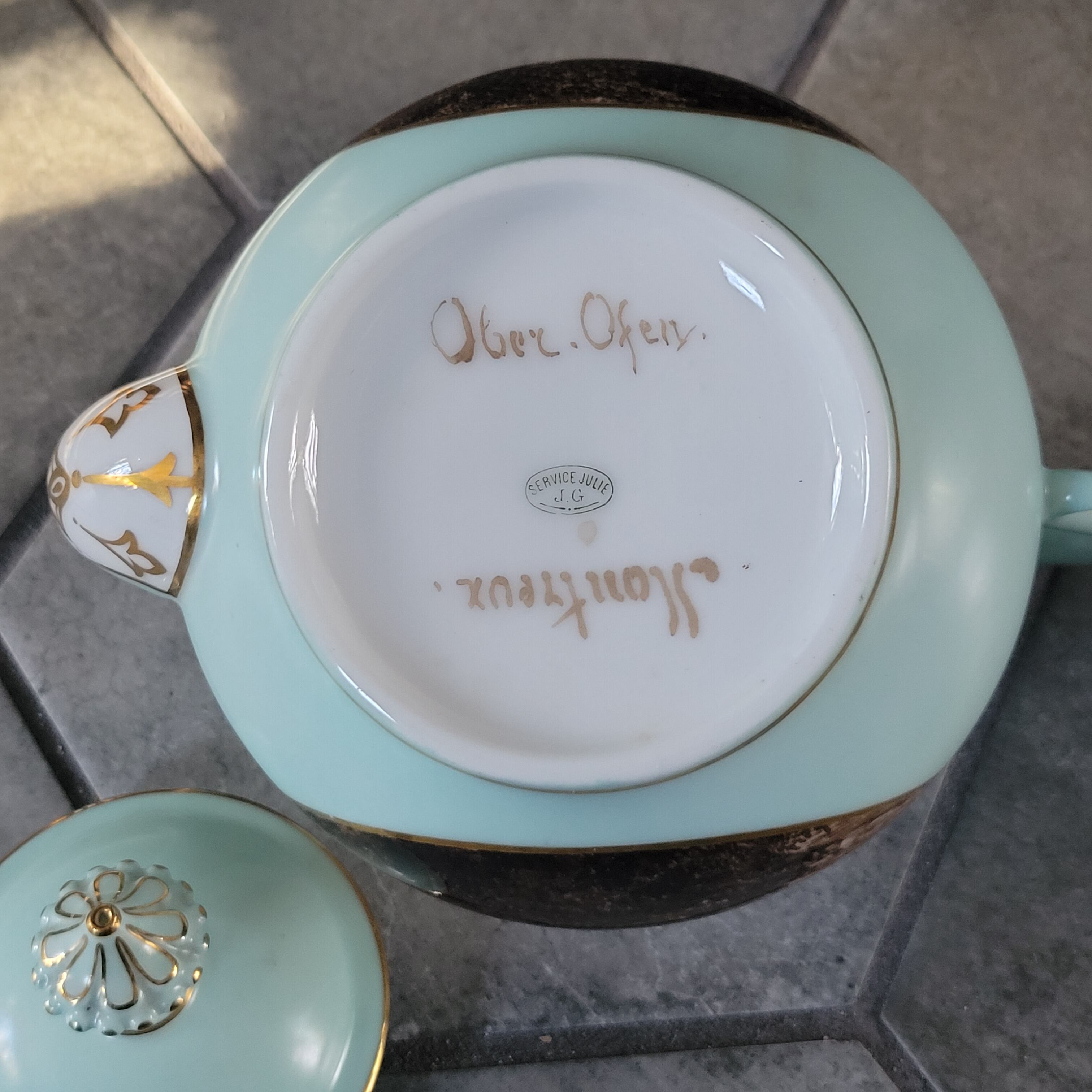 ティーポットにはスイスの“Montreux(モントルー)”と“Ober-Ofen(オーベルホーフェン城)”の絵が、シュガーボウルにはスイスの“Chamonix(シャモニー)”の山々の景色と“Palezieux(パレジュー)”の城の遺跡の景色が描かれています。それぞれの裏側には地名が手書きで記されています。