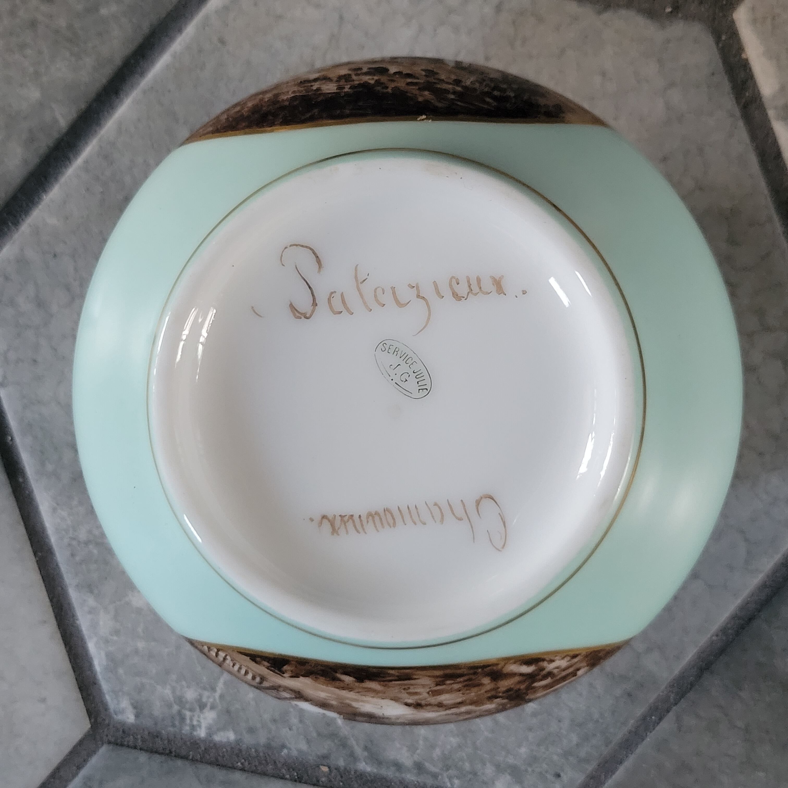 フランス、もしくはドイツで1880年代頃に作られた作品で、窯元が不明なのですが、淡い水色とぽってりとしたシェイプが何とも言えない可愛らしさを演出しています。