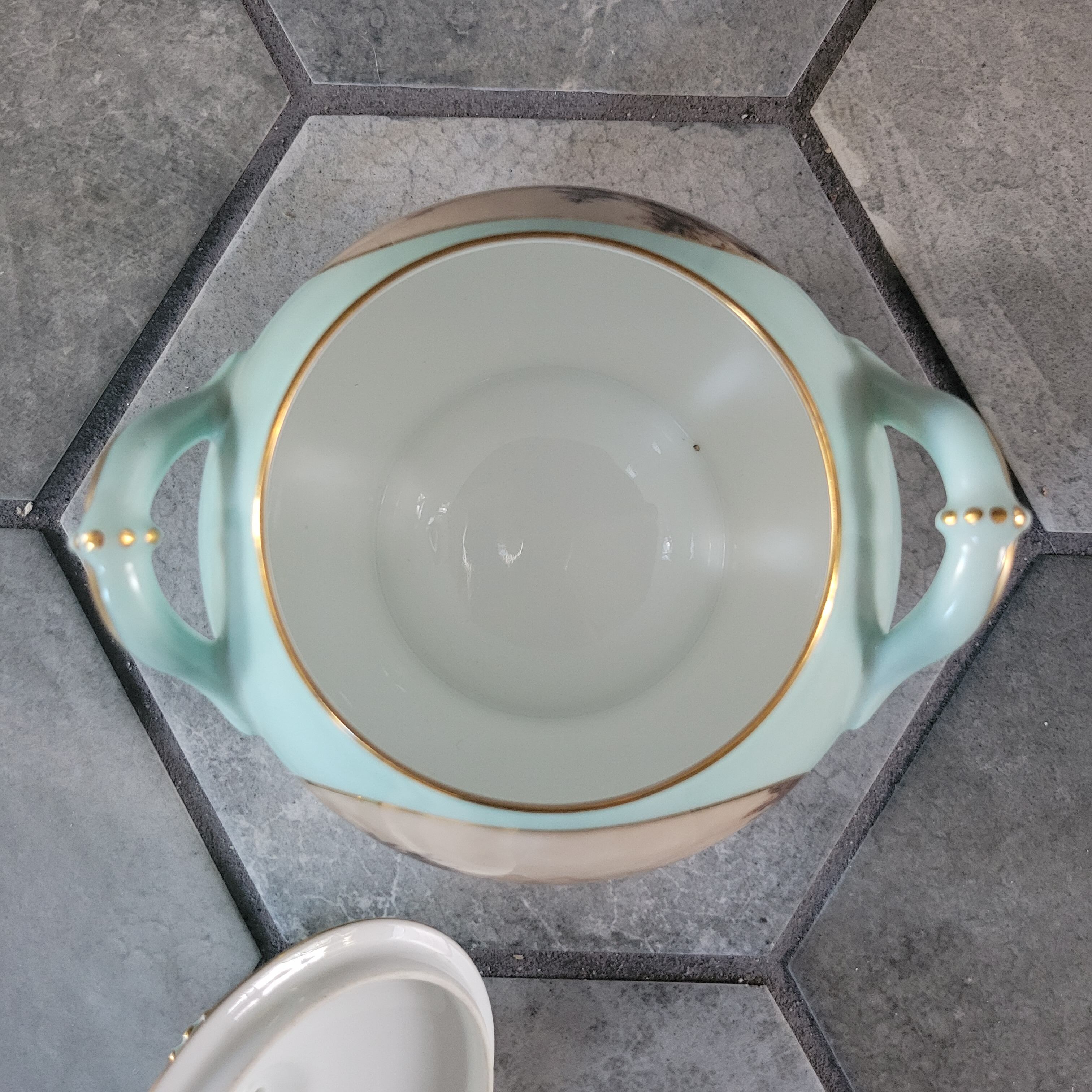 状態:ティーポットの注ぎ口の金彩部分に小さな欠けあり。(写真を参照下さい)ティーポットとシュガーボウルの内側底に小さな黒点がありますが、これは陶磁器を窯で焼く際にやむを得ず発生するものですので、アンティークの味としてお楽しみ下さい。