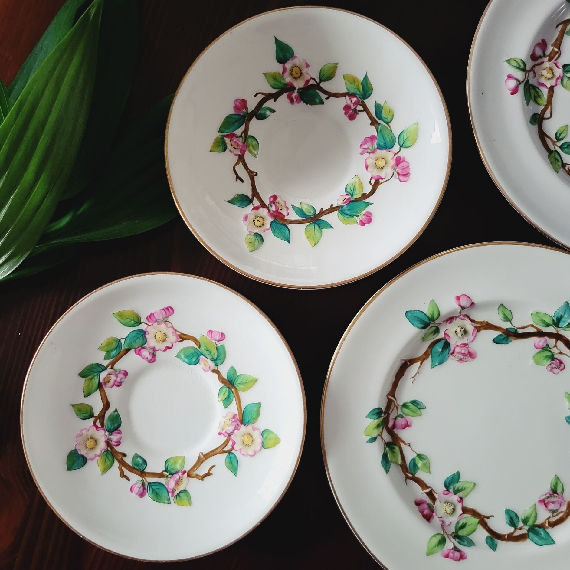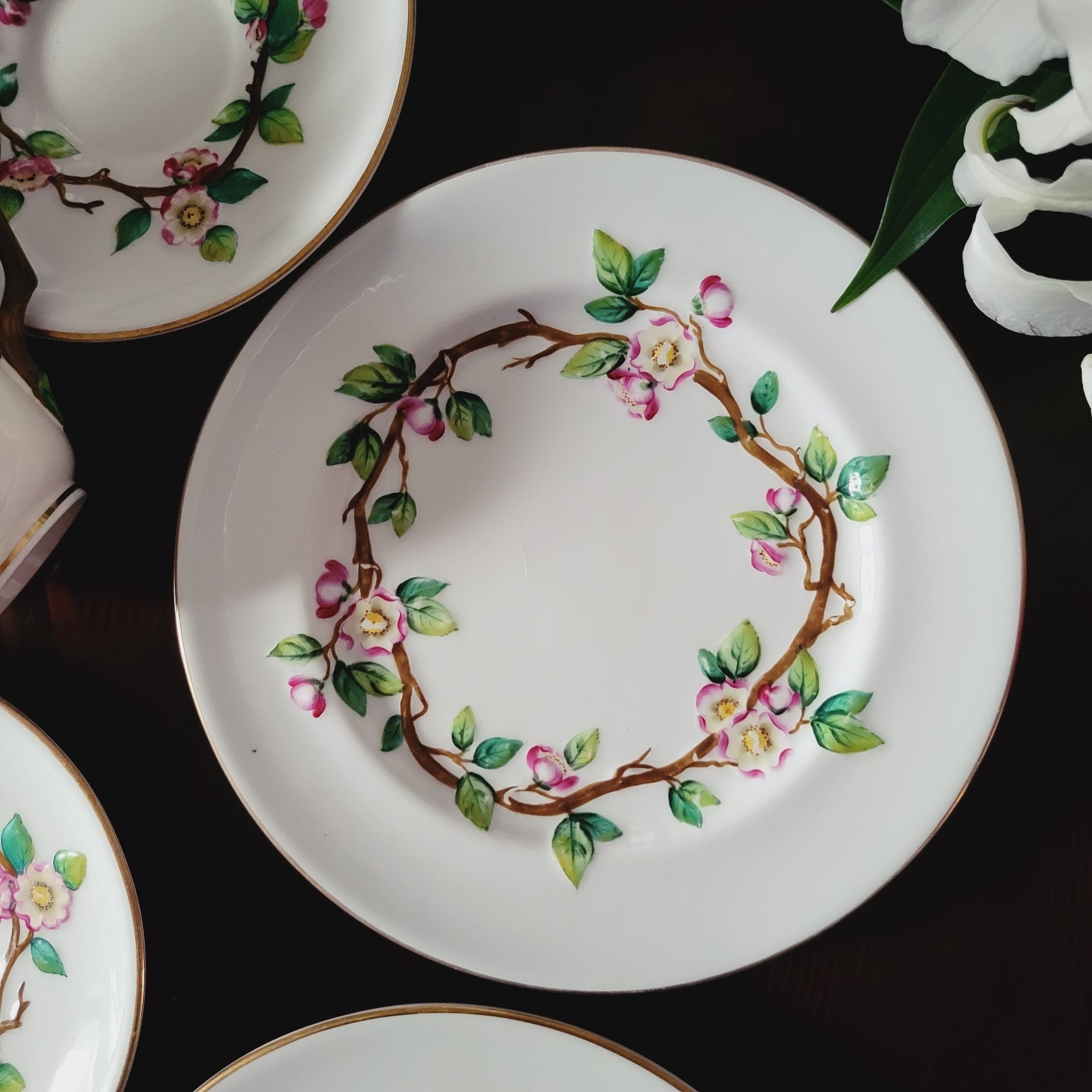 カップ、ソーサー、プレート全てに可愛らしいりんごの花がエンボスで描かれており、木の梢で出来たハンドルが遊び心をくすぐる逸品です。160年程経っているとは思えないほど美しいコンディションですが、カップやソーサーに貫入がございます。ヒビや欠け等はございませんので実用には問題ないと思いますが、100年もののアンティークとして、鑑賞して楽しんで頂くのがよろしいかと存じます。