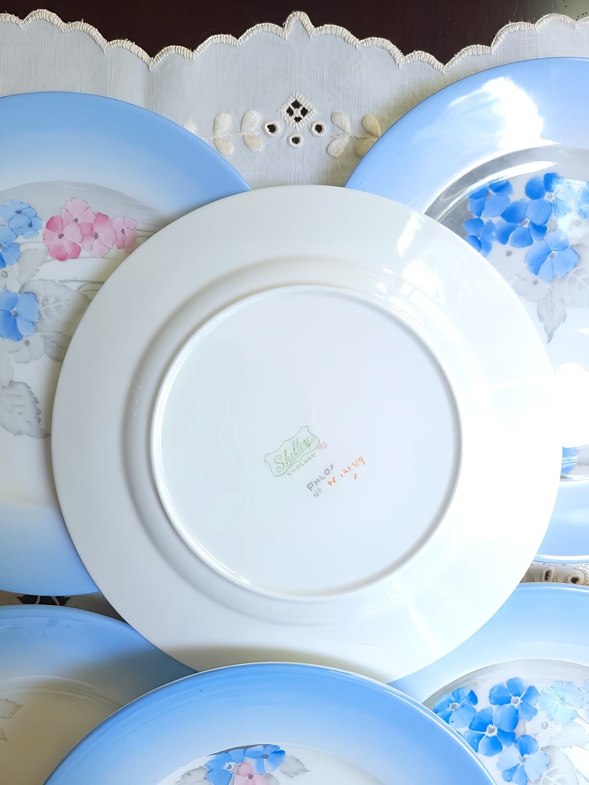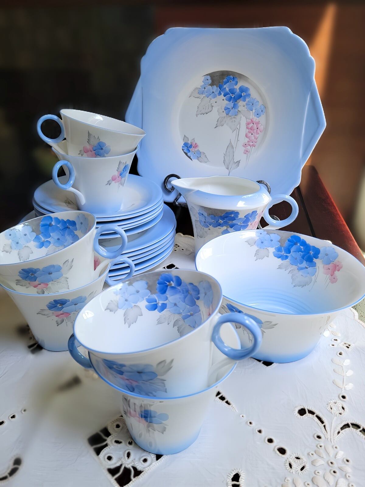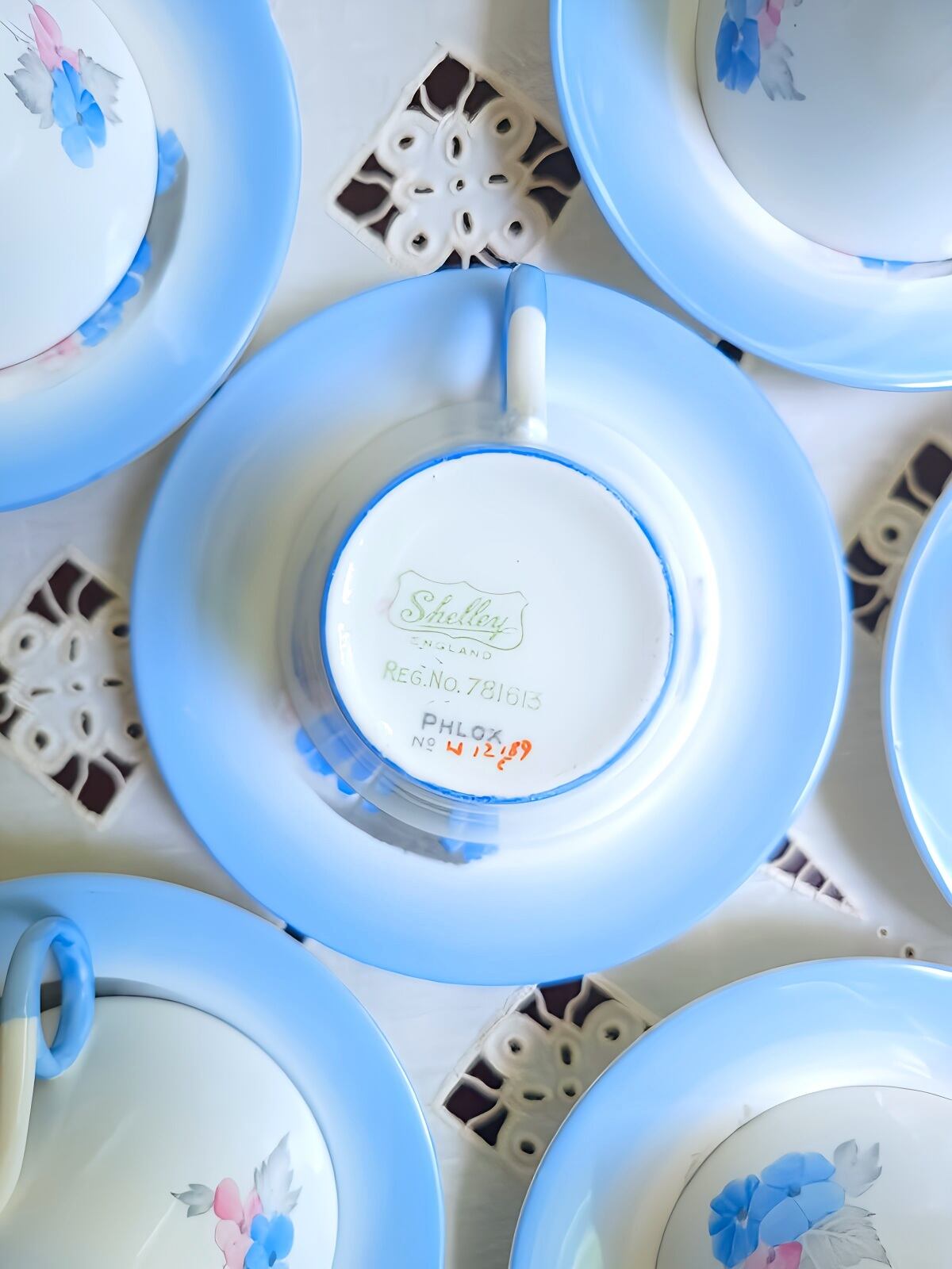 1925~40年代製、イギリスの名陶シェリー(SHELLEY)の人気シリーズ"ブルーフロックス(BLUE PHLOX)"の豪華な6名様用ティーセットです。※ポットはございませんのでご注意下さい。