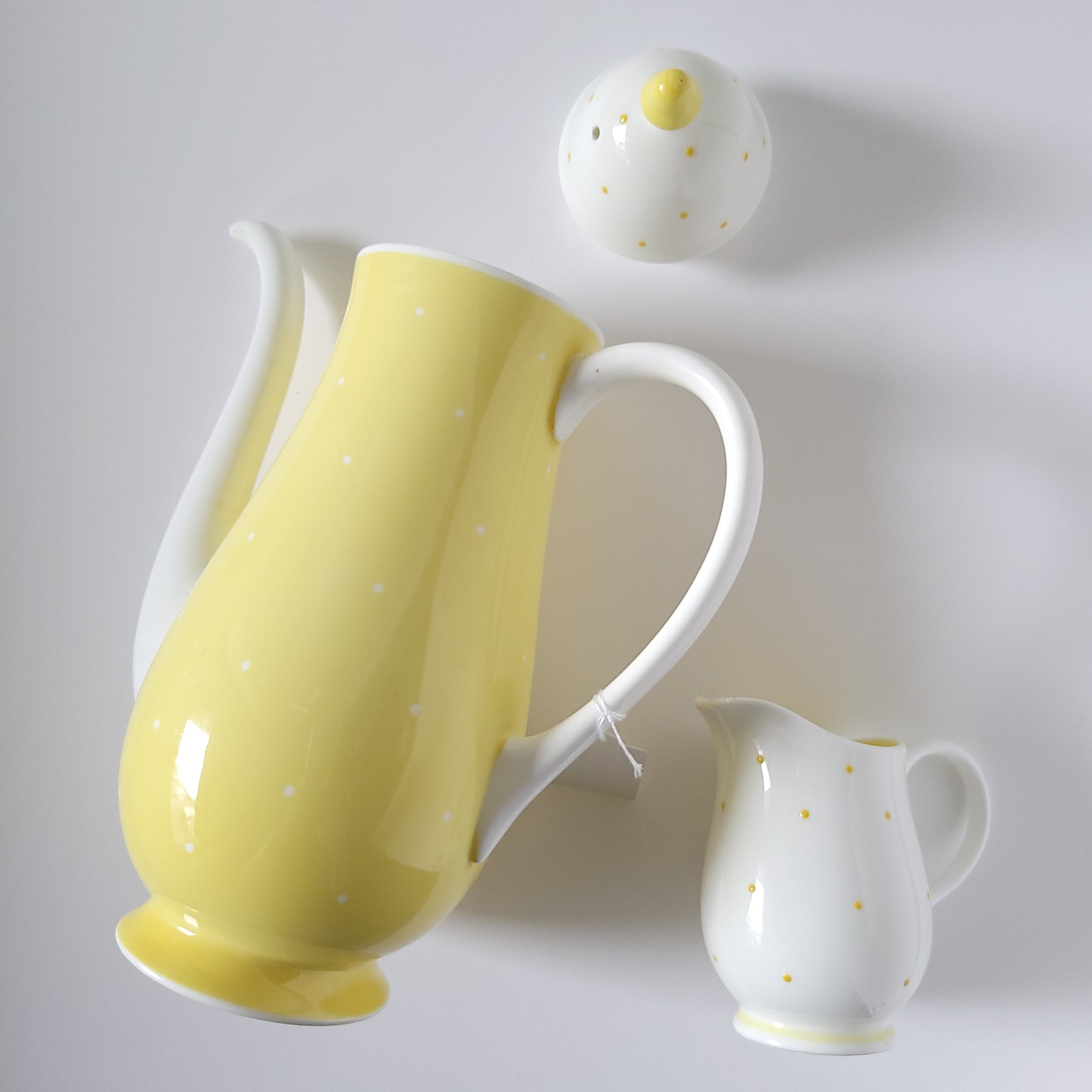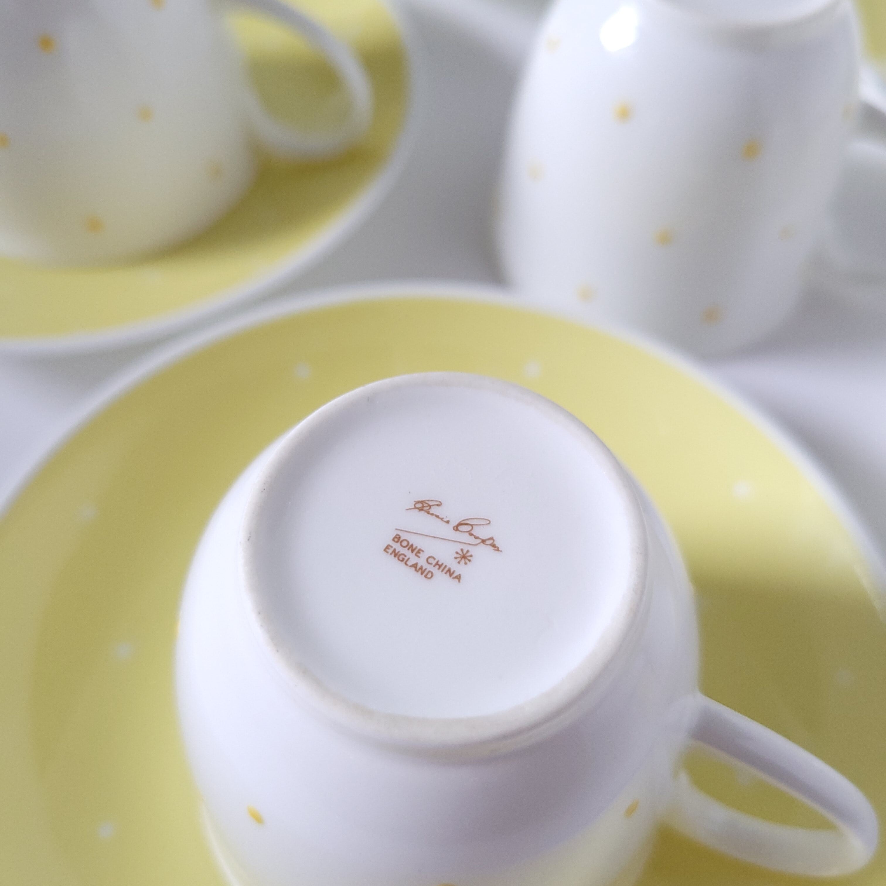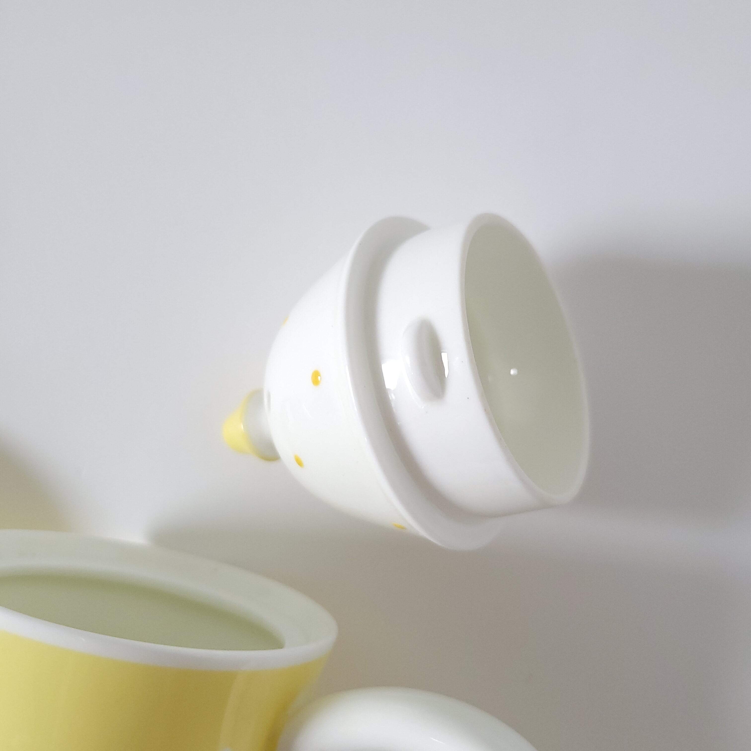 優しい黄色に、手書きで施された立体的なドットが可愛らしく、持ち手は少し緊張してしまうほど細く繊細に作られています。ボーンチャイナ製の為とても薄く、コーヒーを注いでも軽く感じられる仕組みになっています。