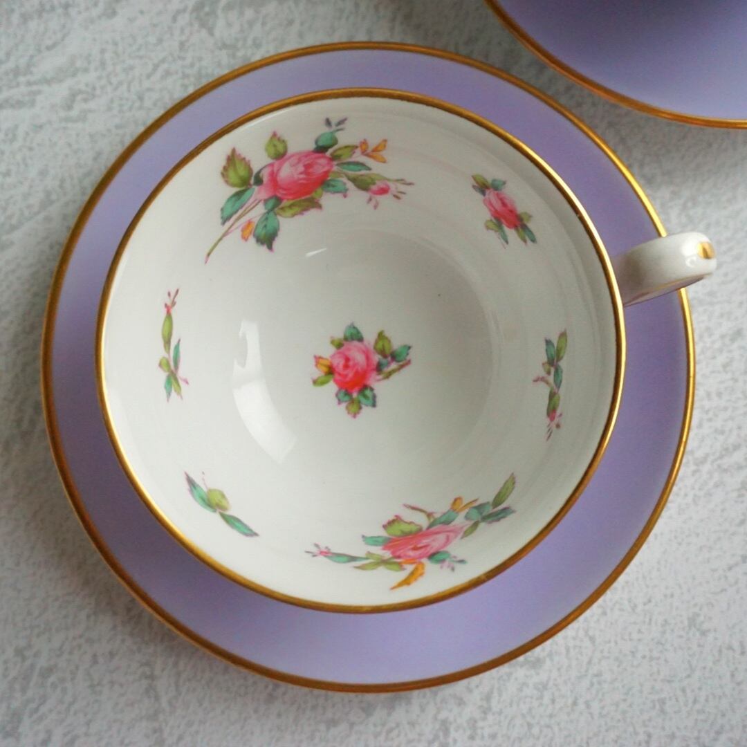 優しい色合いの紫に、純度の高い金彩と手描きのピンクローズがとてもよく映えています。カップを持ち上げると、ソーサーの真ん中にもちゃんとローズが描かれているのが嬉しいポイントです!